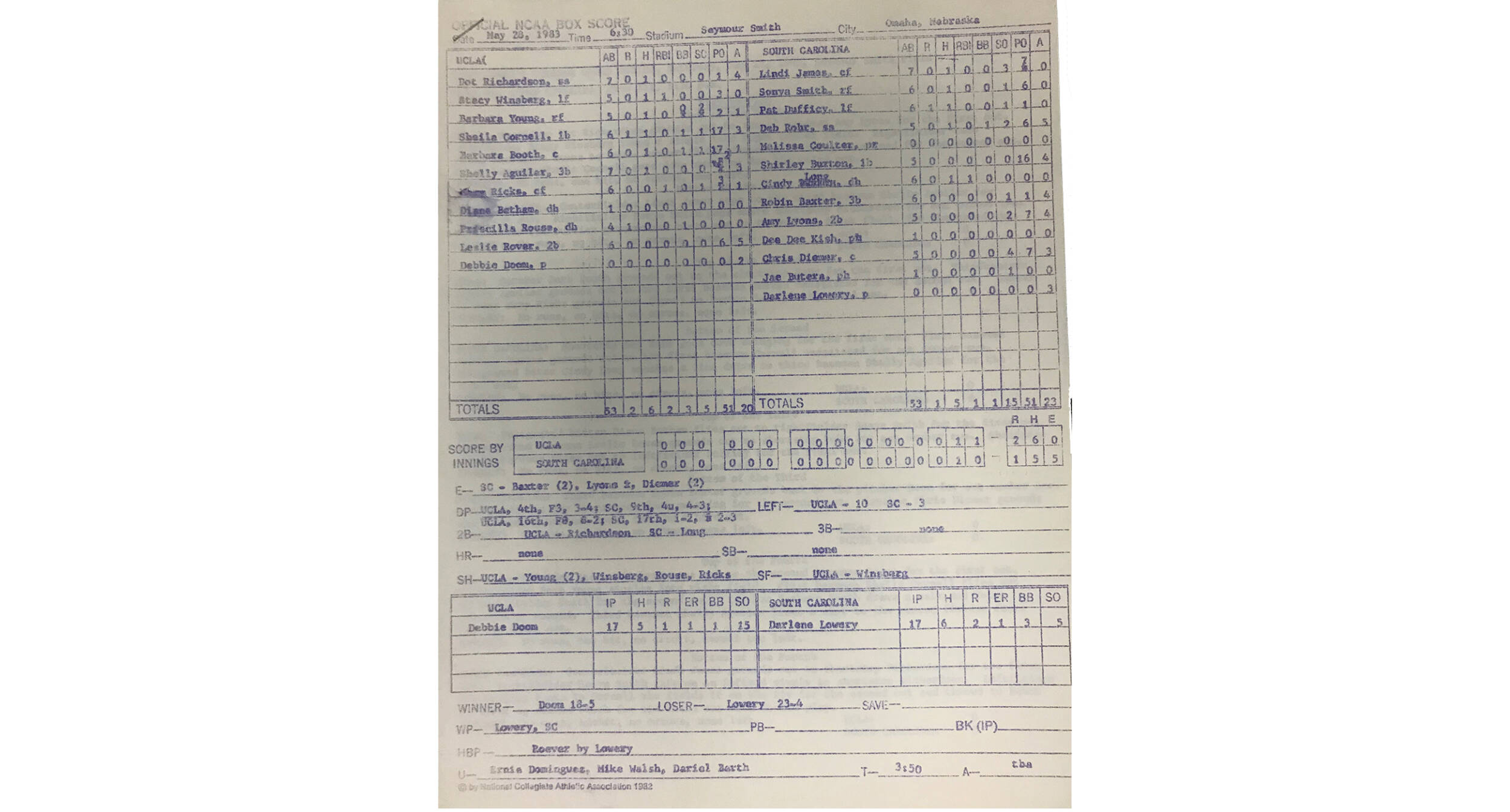 (Below: Box Score from 1983 WCWS game)