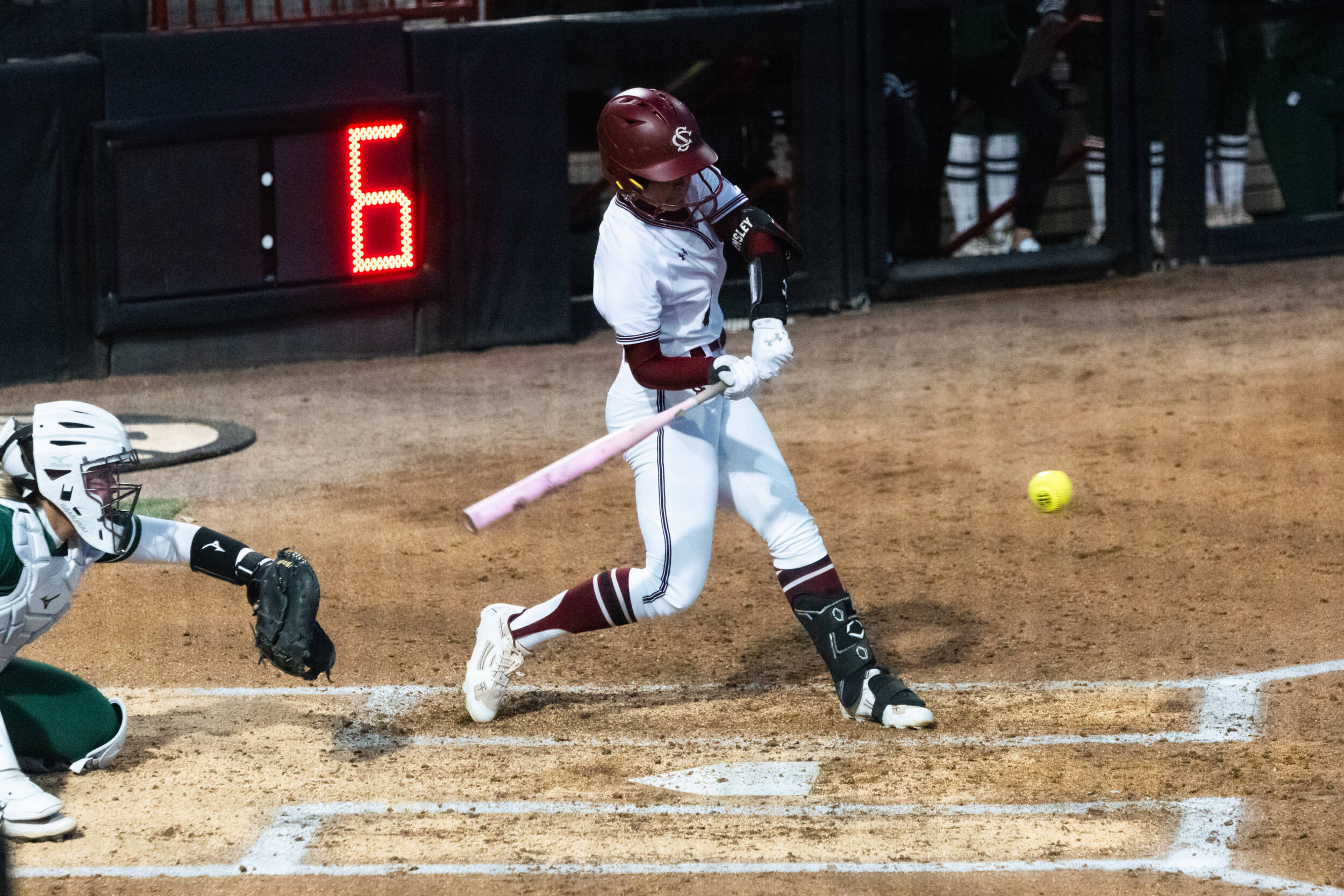 South Carolina started the scoring in the bottom of the second when Winters hit an RBI double off the base of the wall in left field to bring home Ensley. McKnight extended the lead with an RBI double of her own to score Winters.